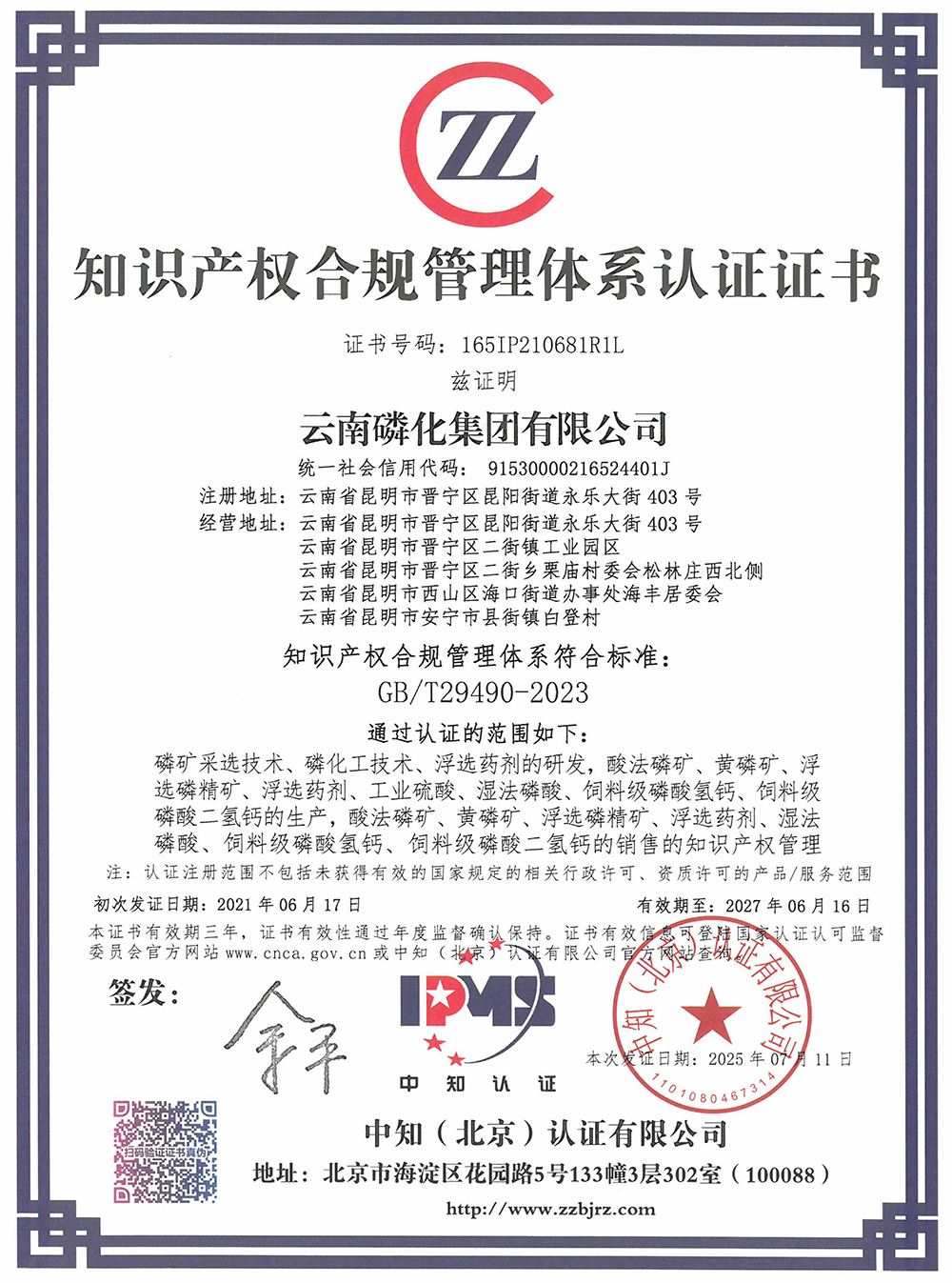 《企業(yè)知識產權合規(guī)管理體系要求》新標準于2024年1月1日正式實施,在《企業(yè)知識產權管理規(guī)范》基礎上對合規(guī)要素、覆蓋范圍和標準結構進行了優(yōu)化,為企業(yè)建立知識產權管理體系、防范知識產權風險、實現(xiàn)知識產權價值提供了參照標準。新標準突出了知識產權管理的合規(guī)屬性,強化了數(shù)字化轉型、風險防控及國際化合規(guī)要求,旨在推動企業(yè)構建覆蓋知識產權創(chuàng)造、保護、運用及風險防控的全生命周期管理體系,強化合規(guī)經營能力,提升核心競爭力。此次通過新標準認證,標志著公司在知識產權創(chuàng)造、運用、保護和管理等關鍵領域達到了新的高度,全面升級至新版國家標準要求,進一步鞏固了公司在磷化工領域的技術創(chuàng)新優(yōu)勢地位。